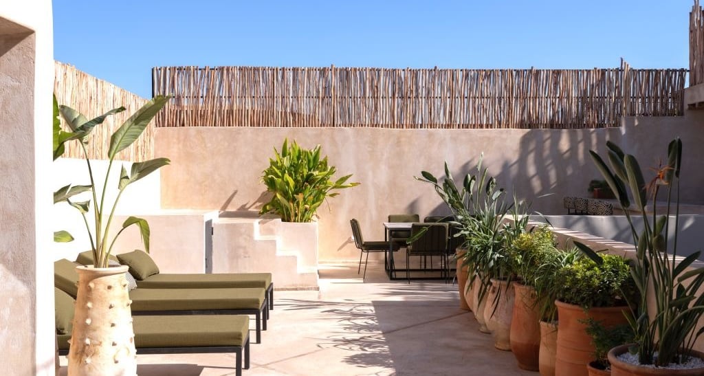 Les espaces de vie offrent une atmosphère chaleureuse et sophistiquée : suites spacieuses aux tons apaisants, textiles raffinés, œuvres d’art locales et confort haut de gamme. La terrasse panoramique, dominant les toits de la médina, invite à la détente entre ciel et minarets, idéale pour un petit-déjeuner au lever du soleil ou un dîner intimiste sous les étoiles.